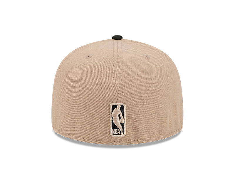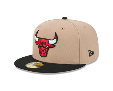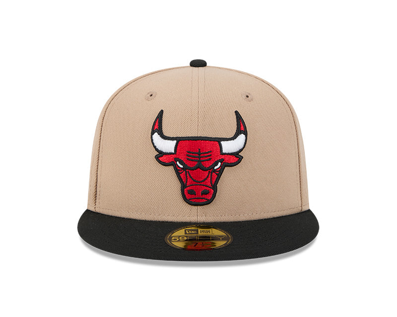 Este modelo de colección presenta una corona alta y estructurada de seis paneles donde resalta el legendario logotipo del toro bordado en relieve con sus colores oficiales: rojo y negro. Al ser una silueta 59FIFTY (Fitted), ofrece un diseño cerrado y una visera plana en color negro sólido que genera un contraste visual impecable con la base beige. El diseño se completa con un undervisor gris clásico, el logotipo de la NBA bordado en la parte posterior y los ojales superiores a tono para una ventilación óptima.
