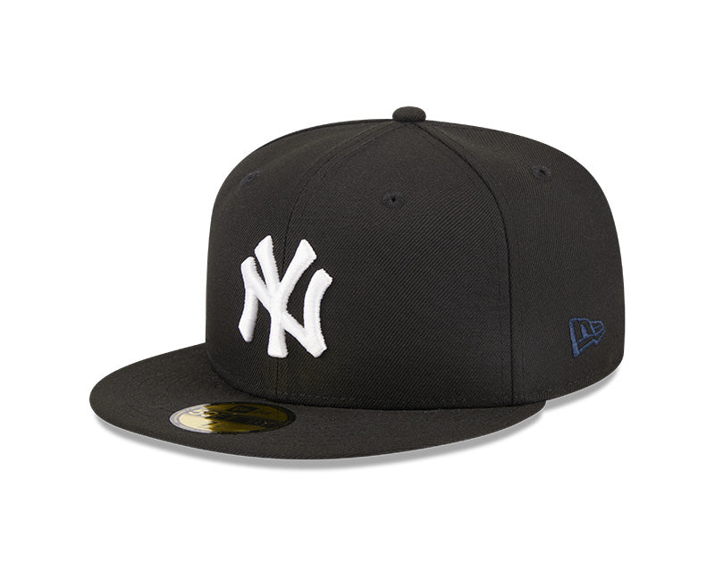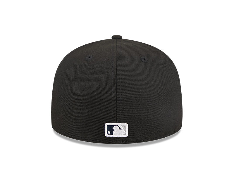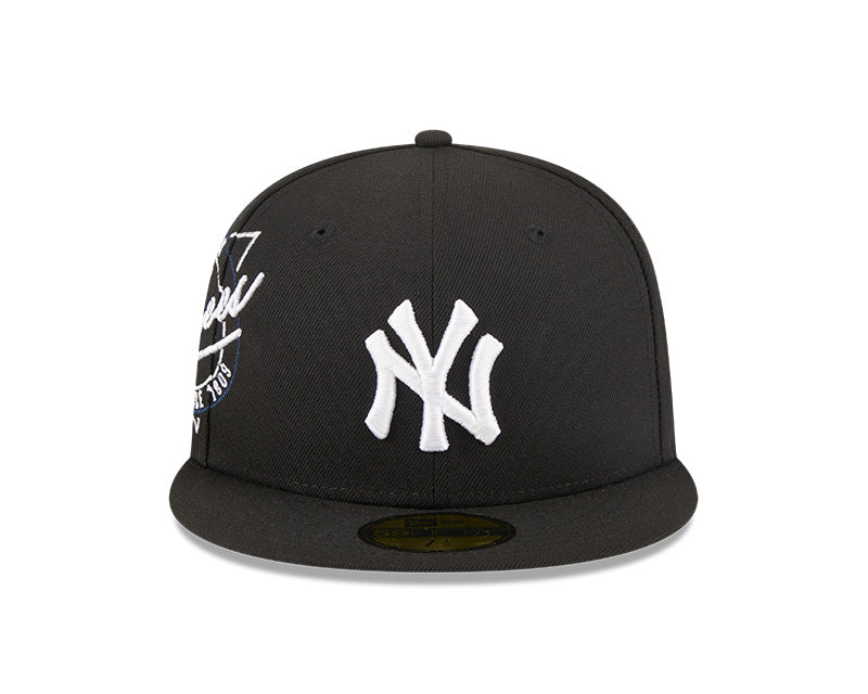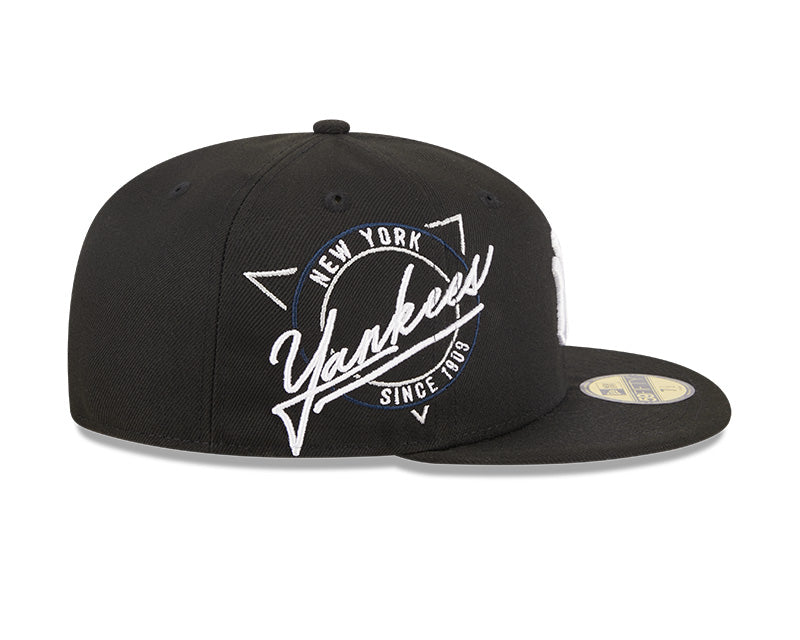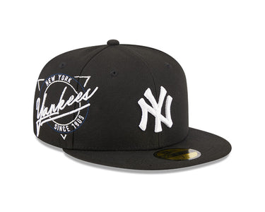 La silueta 59FIFTY ofrece el calce cerrado ("Fitted") icónico, con una corona de seis paneles altamente estructurada que mantiene un perfil alto y firme. En el panel frontal, el logotipo "NY" está bordado en relieve en color blanco con un delineado nítido. El elemento más distintivo de esta pieza es su parche lateral de gran tamaño, que exhibe el nombre "Yankees" en una tipografía estilizada rodeada de elementos gráficos dinámicos en blanco. El diseño se completa con una visera plana, un undervisor gris clásico, la bandera de New Era en el lateral y el logotipo de la MLB en la parte posterior.