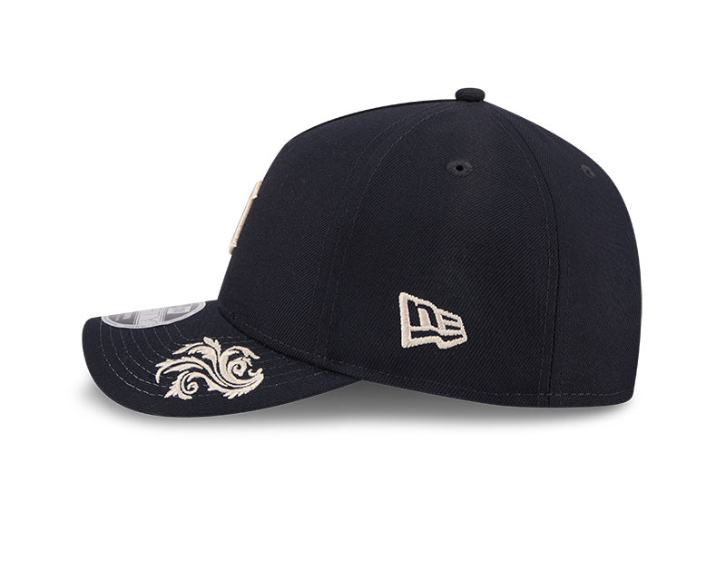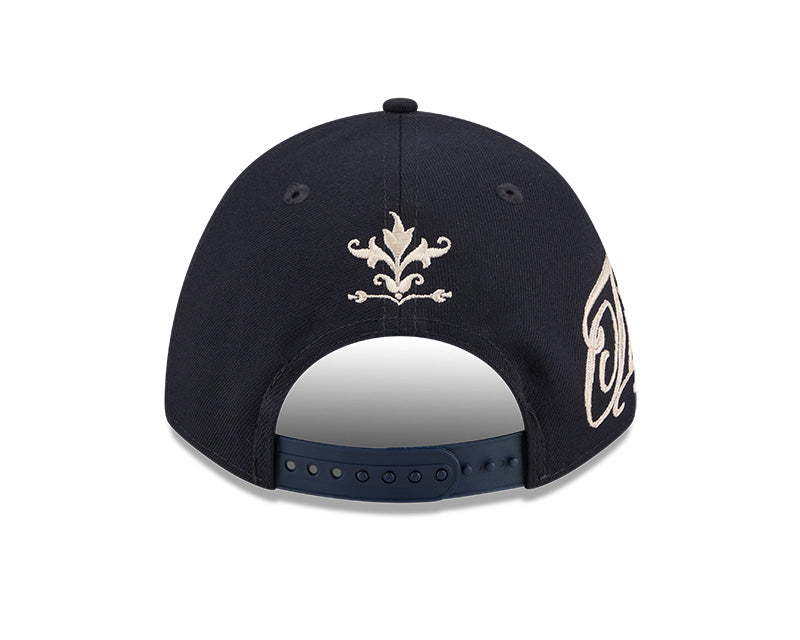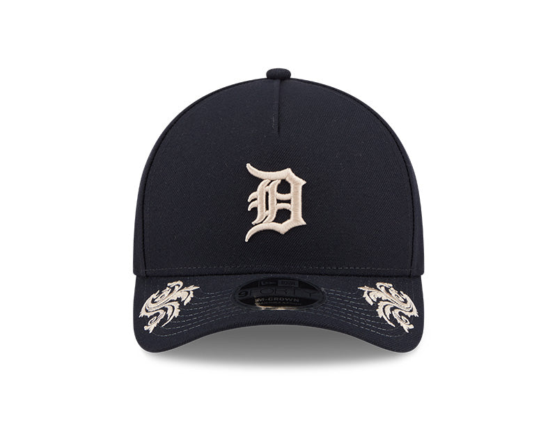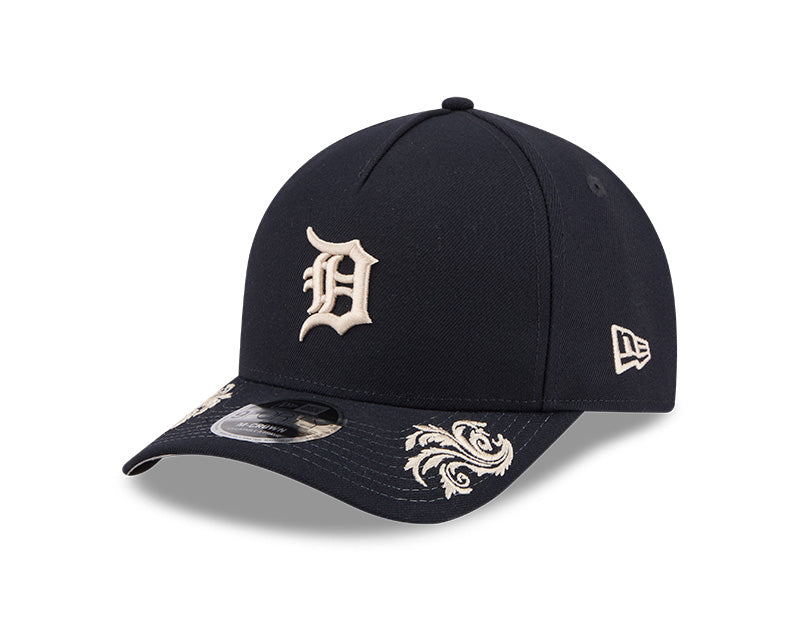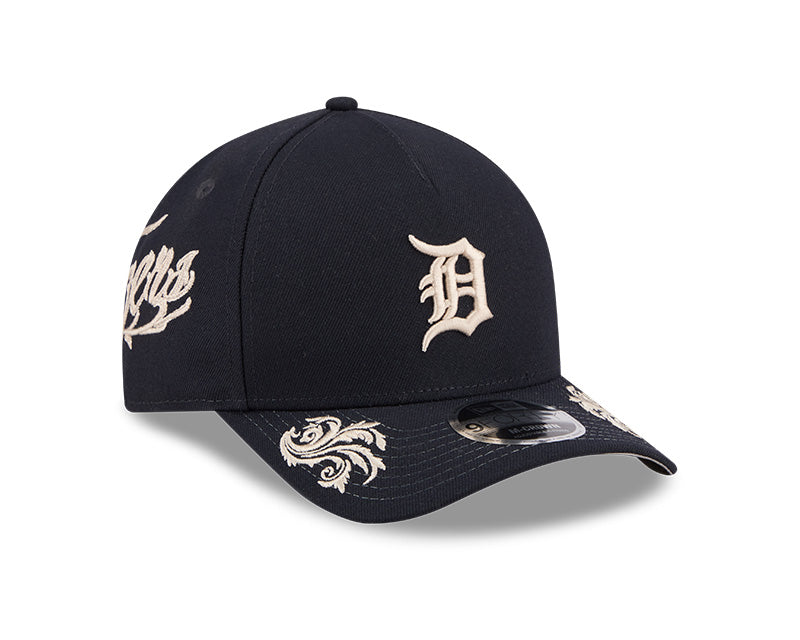 La silueta 9FORTY A-Frame ofrece un perfil único con un panel frontal de una sola pieza que proporciona una corona estructurada, alta y estilizada. El frente exhibe la emblemática "D" gótica de los Tigers bordada en relieve en un elegante tono crema. El diseño se eleva con el script "Tigers" en cursiva bordado en el panel lateral y gráficos ornamentales de laureles y escudos distribuidos artísticamente en los paneles frontales y sobre la visera. Incluye una visera curvada, undervisor gris en contraste y un cierre ajustable "Snapback" en la parte posterior para garantizar un calce perfecto y personalizado.