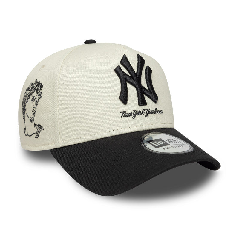 Esta pieza presenta una corona en color beige claro con la silueta A-Frame, que ofrece un perfil alto y estructurado mediante un panel frontal único. El icónico logotipo "NY" está bordado en relieve en la parte frontal en color negro, acompañado lateralmente por la figura de un busto de deidad clásica y otros motivos mitológicos distribuidos en los paneles. Para crear un contraste visual contundente, cuenta con una visera curva en color negro sólido y un undervisor gris. El modelo se completa con un cierre ajustable tipo snapback que garantiza un calce perfecto OSFM (One Size Fits Most).