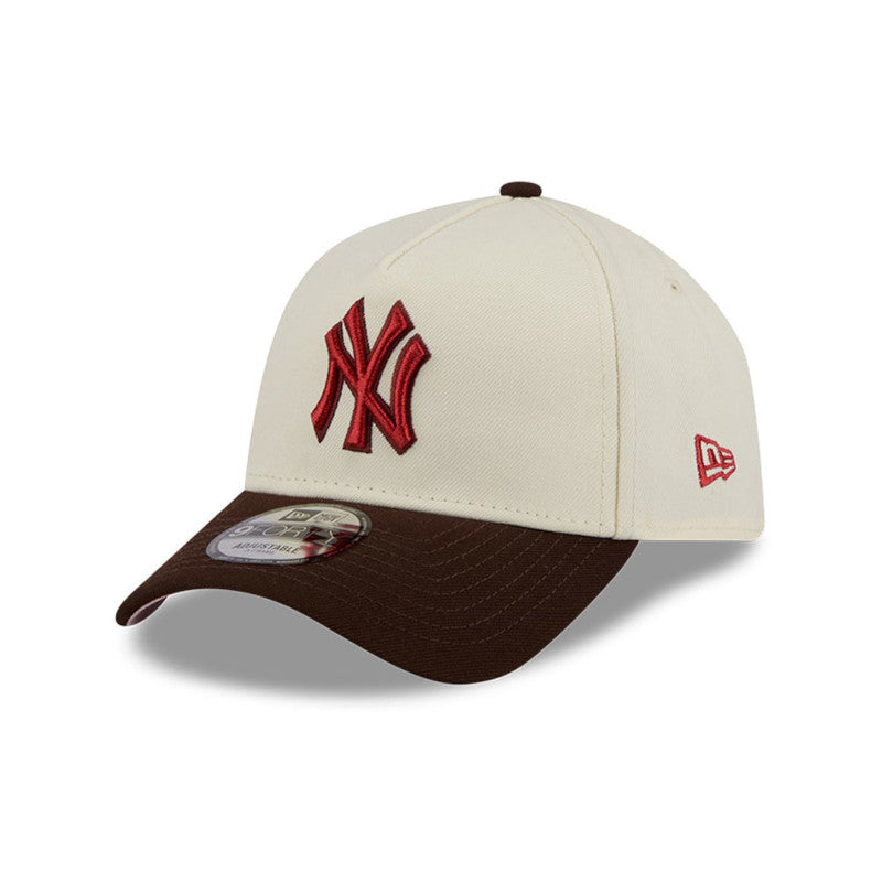La silueta 9FORTY A-Frame combina el estilo clásico de una gorra ajustable con una corona frontal de panel único que crea un perfil alto y angulado muy característico. En el frente, el icónico logotipo "NY" está bordado en relieve en color rojo, aportando un contraste vibrante. Como detalle distintivo de esta edición, el panel lateral derecho incluye el nombre "New York" bordado en una elegante letra cursiva (Script) en color rojo. El diseño se completa con una visera curva, un cierre ajustable de tela en la parte posterior para un calce a medida y la bandera de New Era bordada en el lateral izquierdo.