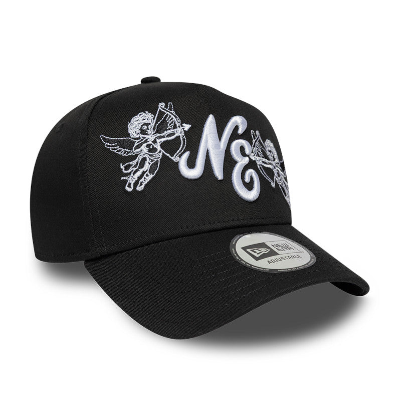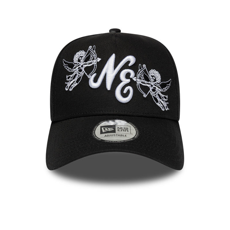 obre una base de color negro sólido, resalta en el panel frontal el logotipo "NE" en tipografía cursiva, flanqueado por bordados de cupidos con arcos en hilo blanco que aportan un contraste artístico único. La gorra cuenta con una visera curva para un look deportivo y un cierre ajustable de presión (Snapback) en la parte posterior, garantizando un calce cómodo y personalizado.
