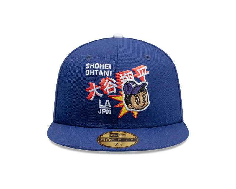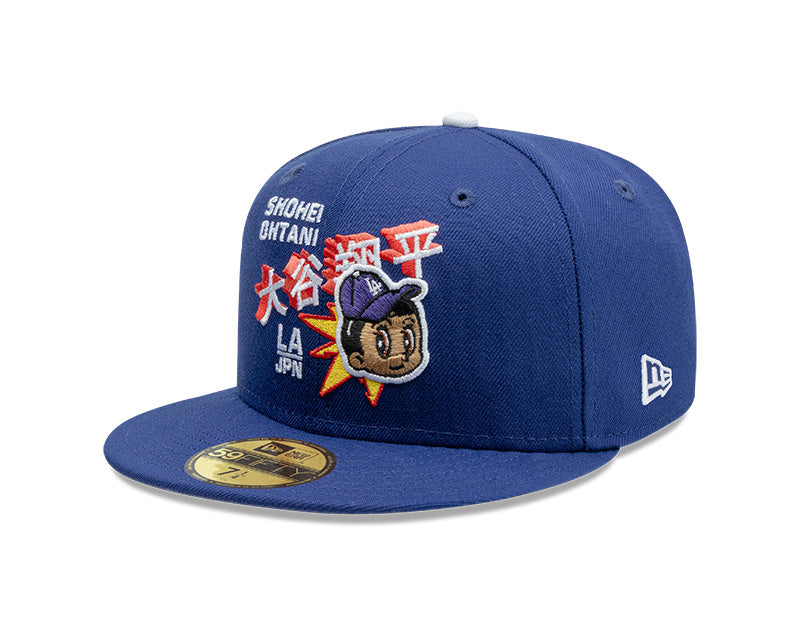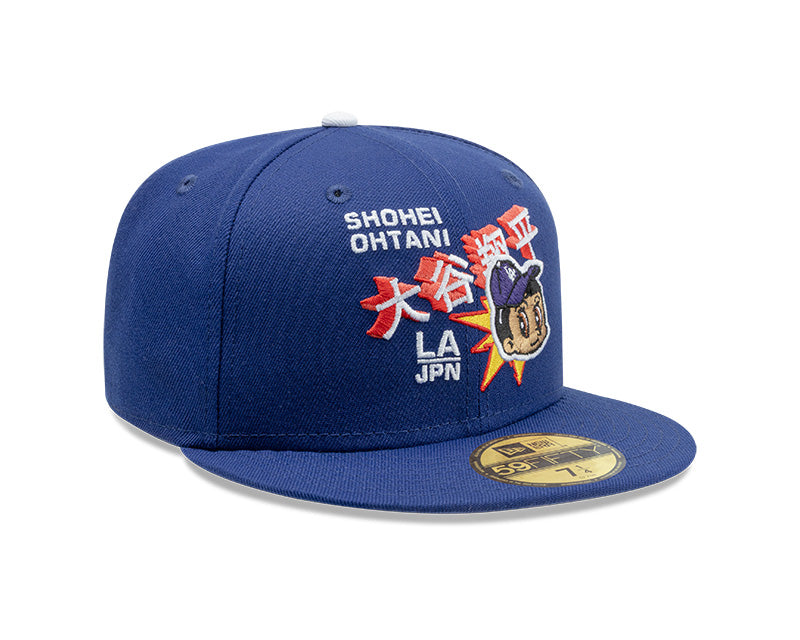 El panel frontal izquierdo destaca por un parche bordado de Shohei Ohtani con un estilo artístico de caricatura, acompañado de caracteres japoneses en rojo y blanco que resaltan sobre el fondo azul. El logotipo "LA" clásico se desplaza ligeramente hacia la parte inferior del panel frontal para dar protagonismo al gráfico central. El diseño se completa con una visera plana, un undervisor gris clásico y el logo de la MLB en la parte posterior, convirtiéndola en un ítem de culto para los coleccionistas.