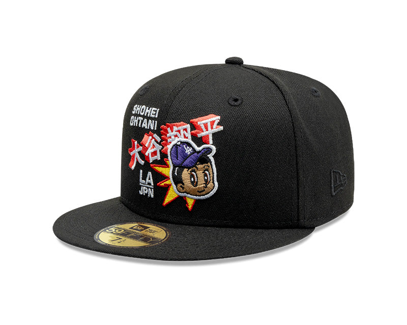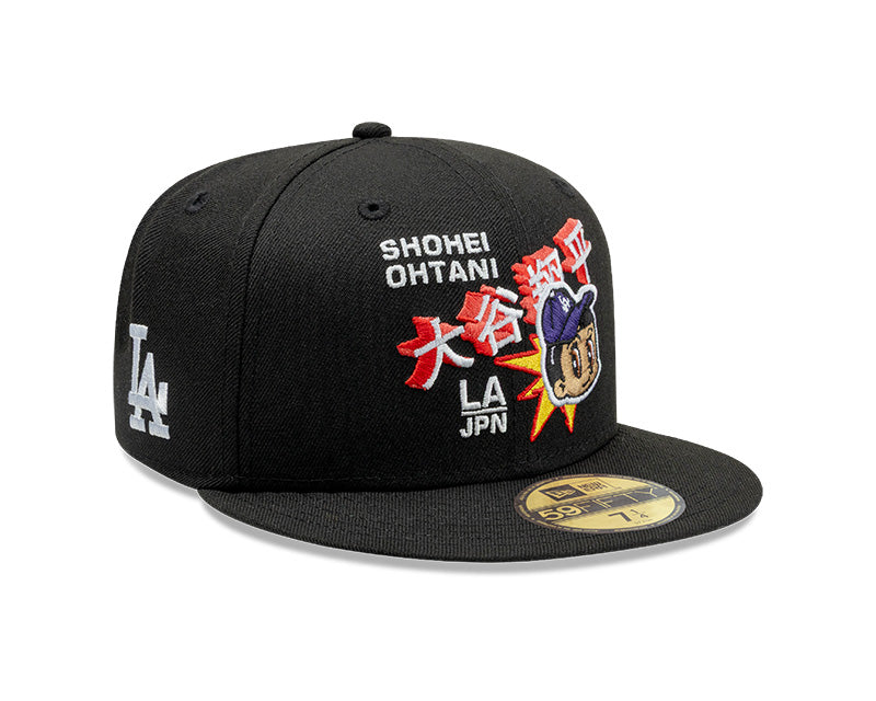 La silueta 59FIFTY ofrece el legendario calce cerrado ("Fitted") con una corona de seis paneles altamente estructurada que mantiene un perfil alto y profesional. El panel frontal izquierdo se distingue por un parche bordado de Shohei Ohtani con un estilo artístico de caricatura, acompañado de caracteres japoneses en rojo y blanco que generan un contraste vibrante sobre el fondo negro. El logotipo "LA" clásico se ubica sutilmente en el lateral para dar prioridad al gráfico central. Para los puristas, el diseño incluye una visera plana con un undervisor verde tradicional y el logotipo de la MLB en la parte posterior, consolidando esta gorra como un ítem de culto para coleccionistas.
