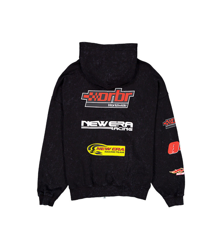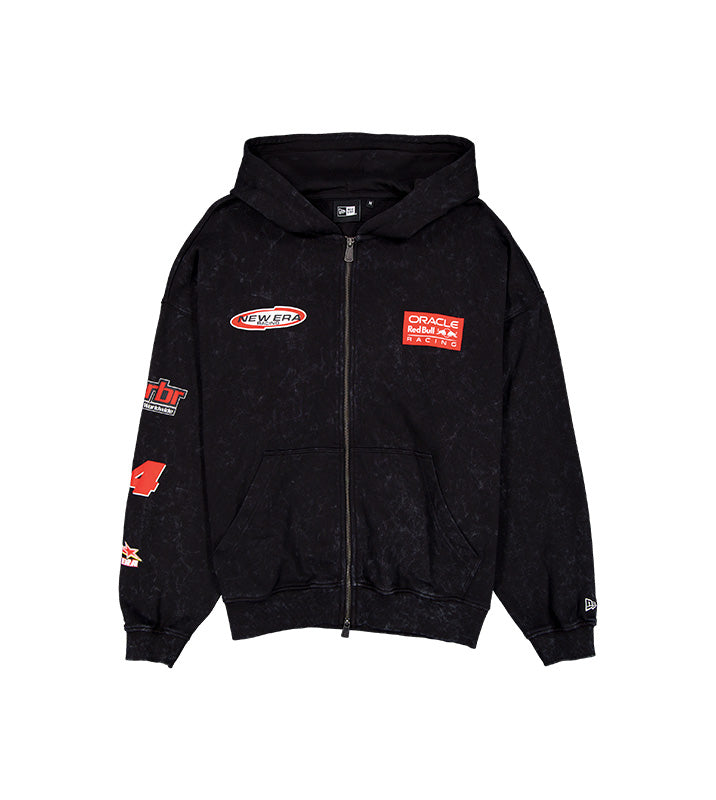 Confeccionado en color negro con efecto washed, presenta múltiples gráficos y parches inspirados en el equipo Oracle Red Bull Racing y el universo del motorsport. Su diseño incluye capucha, cierre frontal completo y bolsillo tipo canguro, ofreciendo comodidad y funcionalidad para el uso diario. Los detalles gráficos en pecho, mangas y espalda aportan un look dinámico y deportivo ideal para fanáticos de la Fórmula 1 y del streetwear.