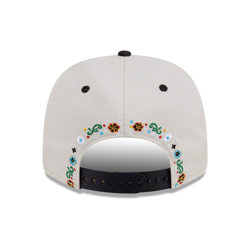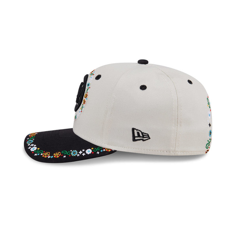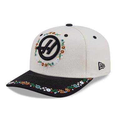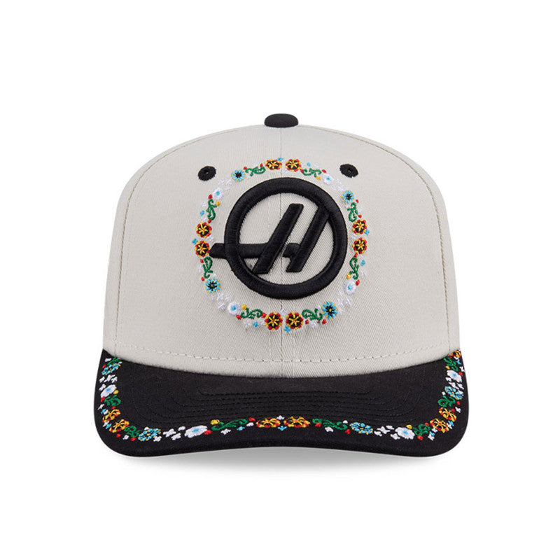 Gorra 9SEVENTY edición México del equipo Haas F1. Diseño blanco con visera negra y detalles florales bordados. Estilo urbano, homenaje a la cultura mexicana con calidad premium de New Era. Ideal para fans del automovilismo.
