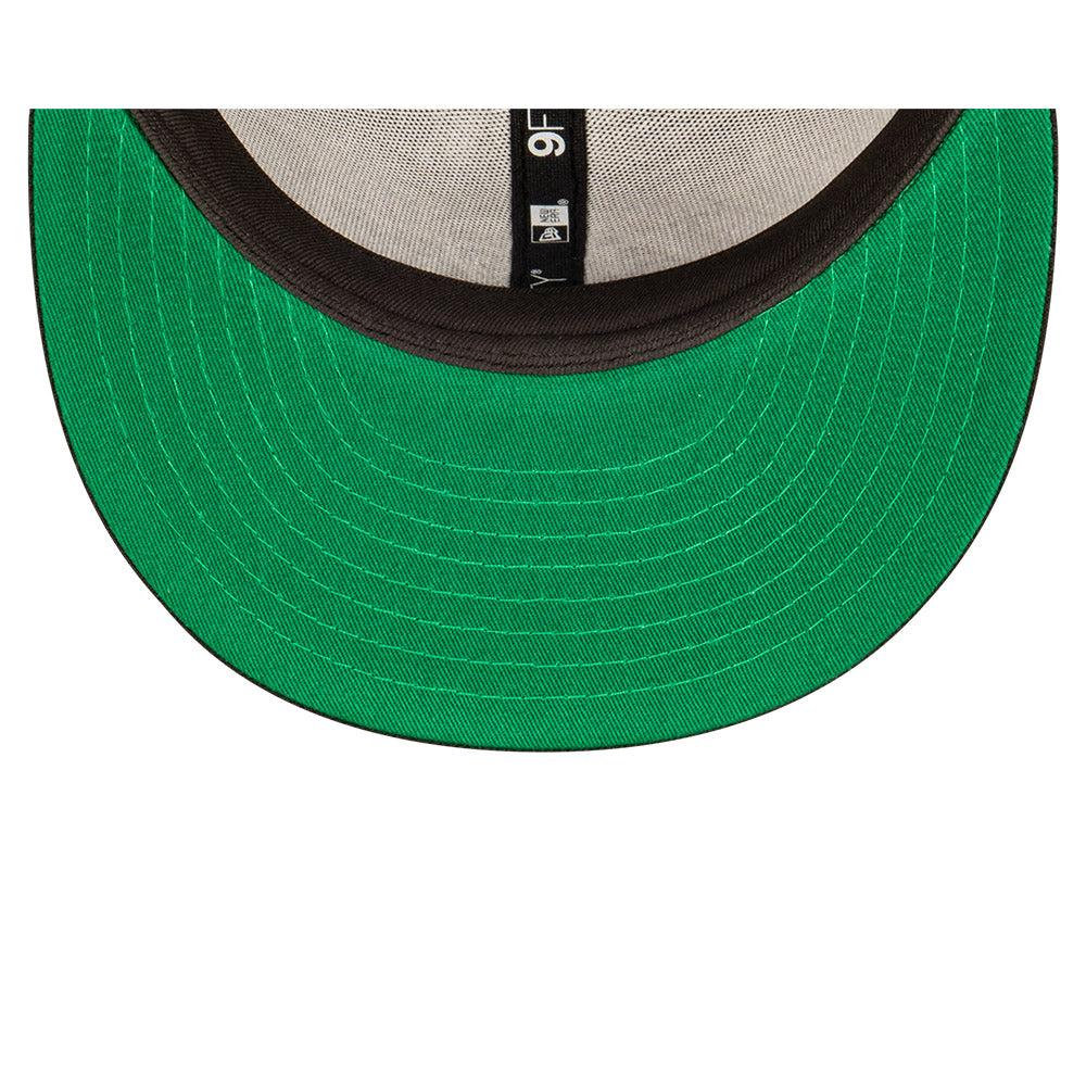 El diseño se distingue por incluir parches conmemorativos laterales que celebran los hitos y campeonatos del equipo, además del logo oficial de la NBA en la parte posterior. Como detalle premium para los amantes de lo clásico, cuenta con una visera inferior (undervisor) en color verde, evocando el estilo retro de las gorras de juego originales. Al ser un modelo fitted (cerrado), ofrece un ajuste profesional y una silueta impecable que no pierde su forma.