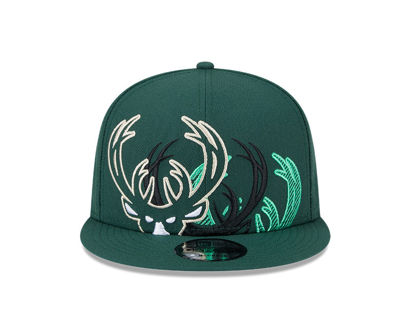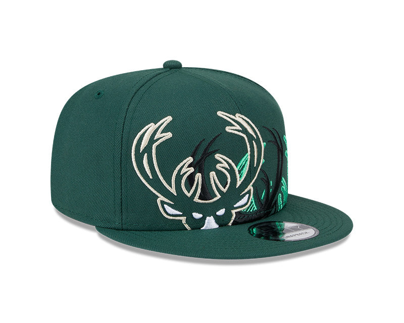La silueta 9FIFTY garantiza el calce snapback clásico, con una corona de seis paneles altamente estructurada y perfil alto que mantiene su forma en todo momento. El diseño se centra en un gráfico frontal de gran tamaño, donde el icónico ciervo de los Bucks aparece bordado en relieve, fusionándose con un patrón dinámico de astas y sombreados que se extiende hacia los laterales en tonos crema y verde claro. La gorra cuenta con una visera plana, un undervisor negro que aporta un acabado sobrio y un cierre ajustable de presión en la parte posterior para un ajuste personalizado.