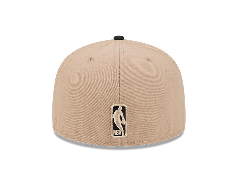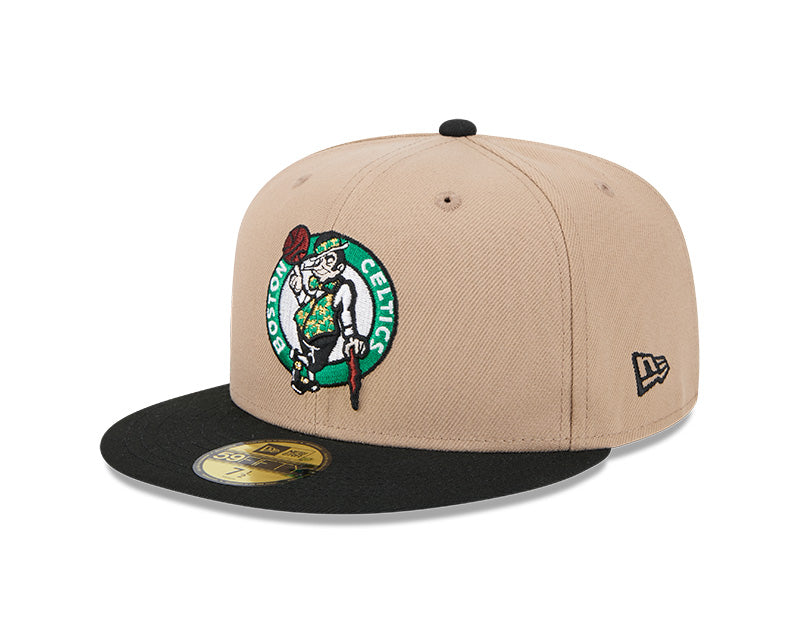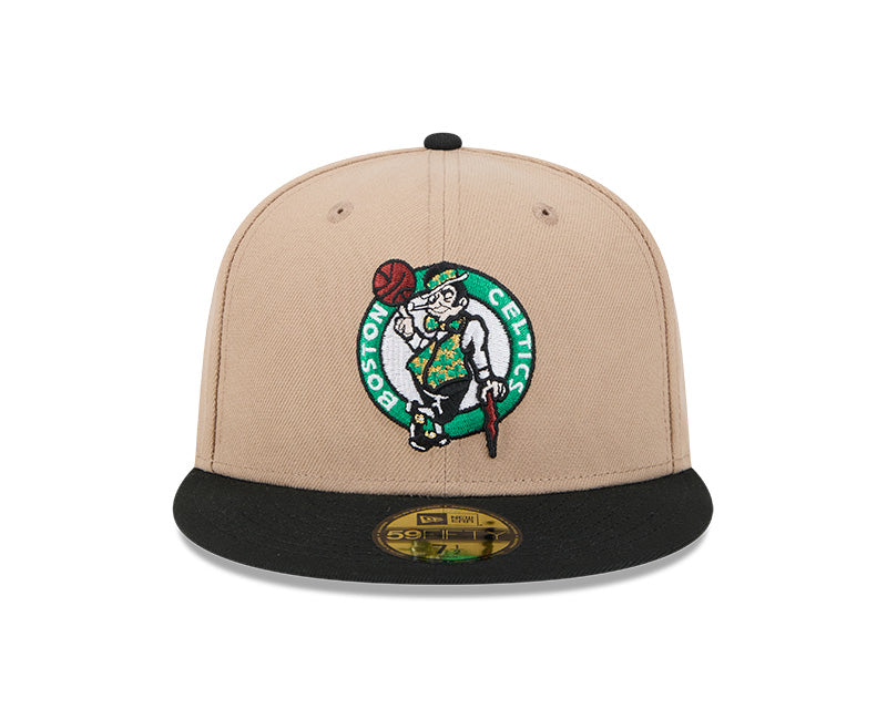 Este modelo presenta una corona alta y estructurada de seis paneles con el icónico logotipo de Lucky the Leprechaun bordado en relieve y a todo color en el frente. Al ser una silueta 59FIFTY (Fitted), cuenta con una visera plana en color negro sólido, creando un contraste elegante con la corona beige. El diseño se completa con el logotipo de la NBA bordado en la parte posterior en colores a tono y un undervisor gris clásico que refuerza su estética de colección.