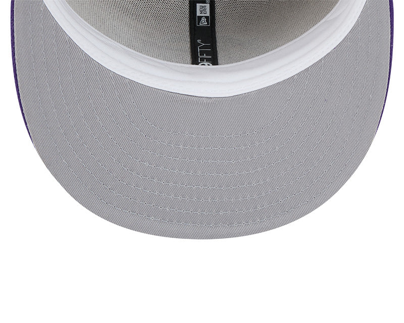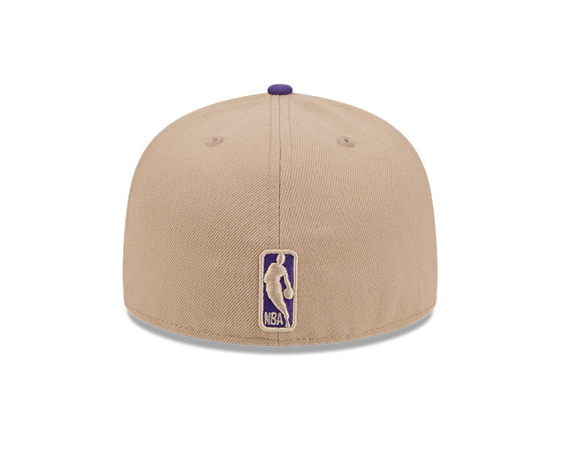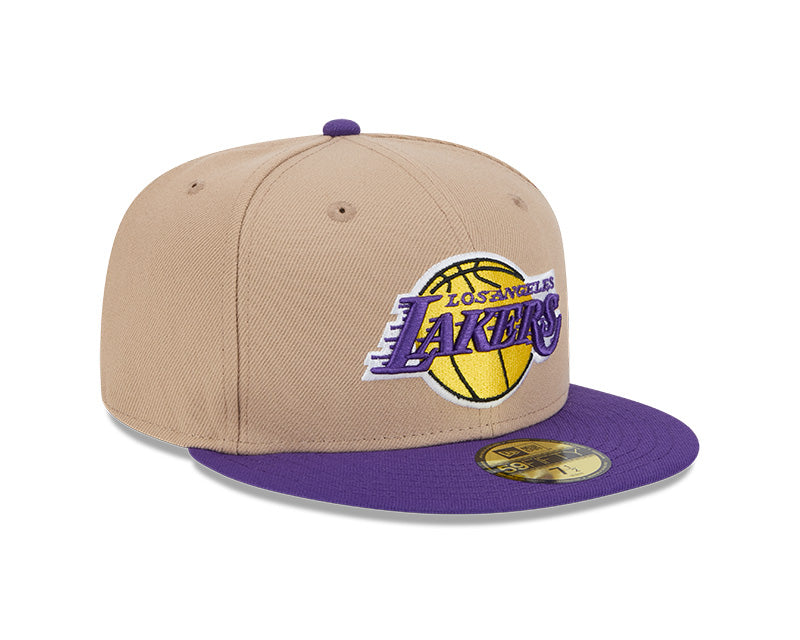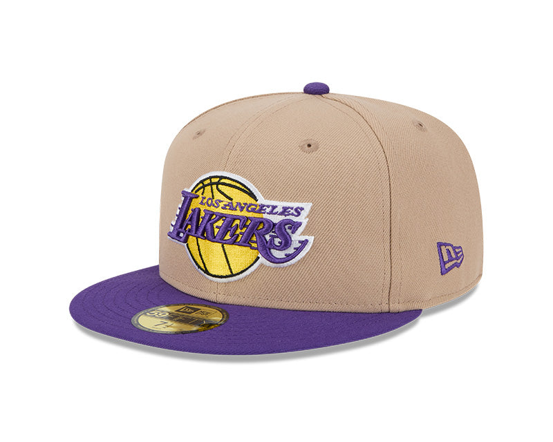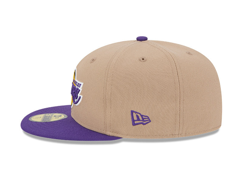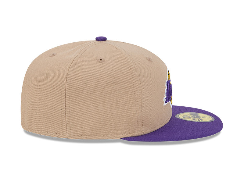 Este modelo cuenta con una corona alta y estructurada de seis paneles, fabricada con la calidad de tejido característica de New Era. En el frente, destaca el icónico logotipo de los Lakers bordado en relieve con sus colores oficiales: púrpura y oro. Al ser una silueta 59FIFTY (Fitted), presenta un diseño cerrado y una visera plana en color púrpura, creando un contraste vibrante y distintivo con la base beige. El diseño se completa con un undervisor gris clásico, el logotipo de la NBA bordado en la parte posterior y ojales superiores a tono para mayor transpirabilidad.