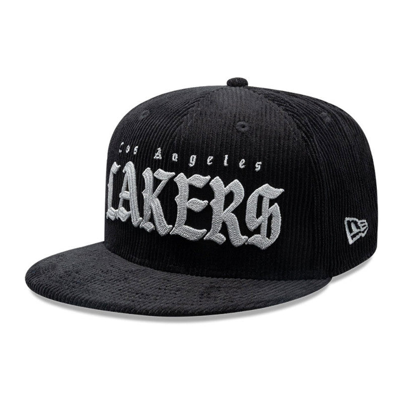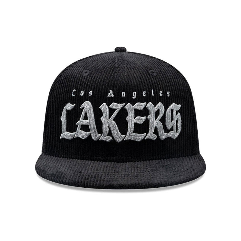 Confeccionada en una base de color negro sólido, esta gorra presenta una corona alta y estructurada que asegura una forma impecable. El nombre "Lakers" está bordado en relieve en el panel frontal con hilo blanco, utilizando la fuente Old English que genera un contraste nítido y elegante sobre el fondo oscuro. Al ser una silueta 9FIFTY, cuenta con una visera plana y un cierre ajustable tipo snapback en la parte posterior, ofreciendo un calce OSFM (One Size Fits Most) cómodo y personalizado para cualquier usuario.