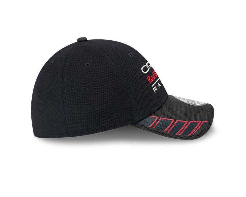 El frente presenta el icónico logo bordado de Oracle Red Bull Racing, acompañado de detalles rojos en la visera inspirados en la velocidad y la ingeniería automotriz. Su estructura stretch-fit se adapta perfectamente a la cabeza, ofreciendo un ajuste ergonómico ideal para el uso diario o los días de carrera.