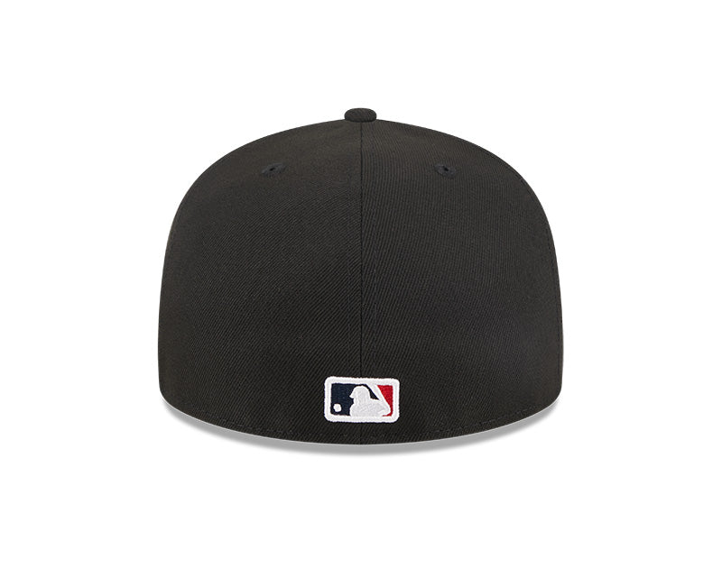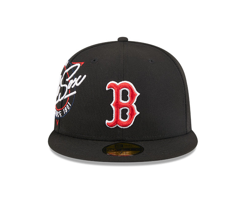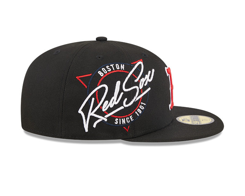 La silueta 59FIFTY mantiene su legendario diseño cerrado ("Fitted") con una corona estructurada de seis paneles que ofrece un perfil alto y firme. En el panel frontal, el logotipo "B" de los Red Sox está bordado en relieve con un intenso color rojo y delineado en blanco. Lo que hace única a esta pieza es su parche lateral de gran tamaño, que presenta la firma "Red Sox" en una tipografía estilizada rodeada de elementos gráficos en rojo y blanco. El diseño se completa con una visera plana, un undervisor gris clásico, la bandera de New Era en rojo en el lateral izquierdo y el logotipo de la MLB en la parte posterior.