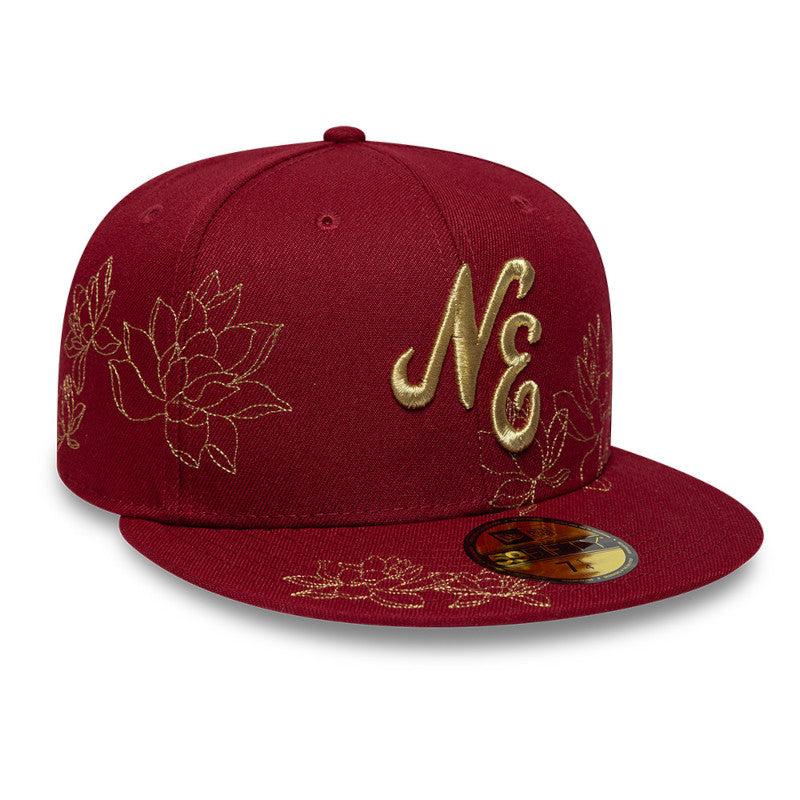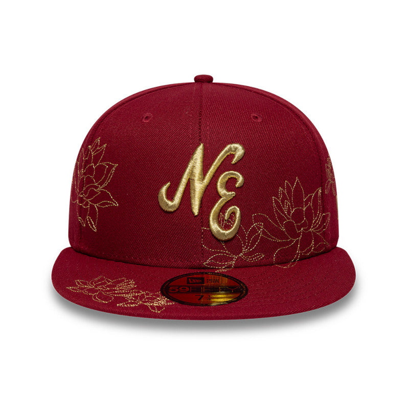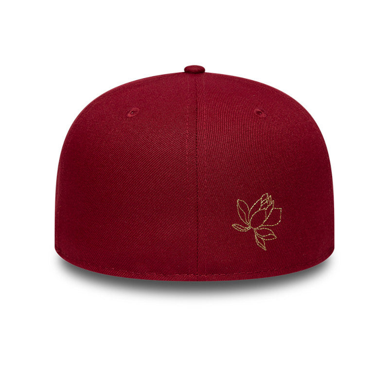Esta silueta 59FIFTY (Fitted) presenta una corona alta y estructurada en un elegante color guinda (scarlet). El diseño se eleva con un intrincado bordado floral en hilo dorado metálico que se extiende artísticamente por los paneles frontales, la visera y los laterales, aportando una textura visual de alta gama.