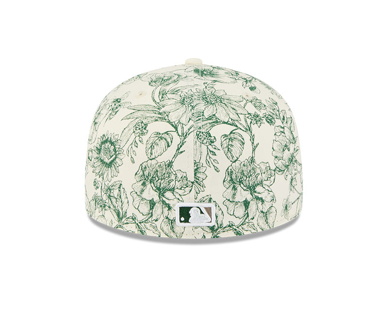 Toda la corona y la visera están confeccionadas en una tela de color hueso, decorada con un detallado estampado de flores y plantas silvestres en tonos verdes, evocando un estilo de grabado clásico. En el panel frontal, el logotipo "Sox" resalta con un bordado en relieve de color blanco con un sutil delineado verde, manteniendo la armonía con el diseño primaveral. Al ser una silueta 59FIFTY, cuenta con una corona estructurada de seis paneles y un diseño cerrado (Fitted) para un ajuste preciso y profesional. El modelo se completa con un undervisor color crema y los logotipos oficiales de New Era y la MLB bordados.