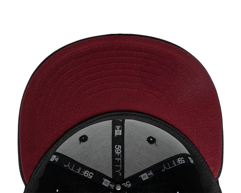 La silueta 59FIFTY representa el estándar de oro de New Era, ofreciendo un calce cerrado ("Fitted") con una corona de seis paneles altamente estructurada que mantiene su perfil alto y elegante. El diseño se complementa con detalles premium, como la bandera de New Era bordada en color rojo en el lateral izquierdo y el logotipo de la MLB en la parte posterior, también en rojo, creando un contraste visual impactante. Esta pieza de colección se finaliza con una visera plana y un undervisor de color bordó (maroon), aportando un toque de distinción y profundidad al diseño general.