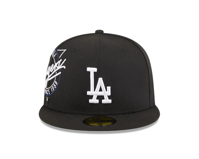 La silueta 59FIFTY ofrece el legendario calce cerrado ("Fitted") con su corona estructurada de seis paneles y perfil alto que mantiene una forma impecable. En el panel frontal, el logotipo "LA" está bordado en relieve con un intenso color azul y delineado en blanco. La pieza central de este diseño es su parche lateral de gran tamaño, que muestra el nombre "Dodgers" en una tipografía estilizada acompañada de detalles gráficos en azul y blanco. El diseño se completa con una visera plana, un undervisor gris clásico, la bandera de New Era en el lateral y el logotipo de la MLB en la parte posterior.