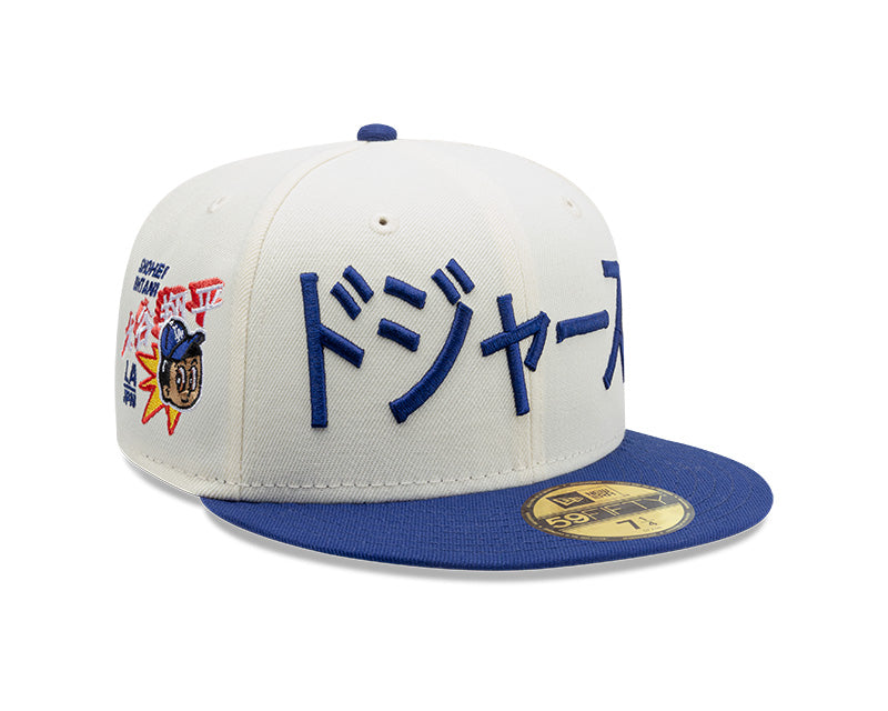 El panel frontal destaca por el nombre del equipo bordado en caracteres japoneses (Katakana) en relieve de color azul, mientras que el lateral presenta un parche artístico de Ohtani acompañado de gráficos conmemorativos. El diseño se completa con el logotipo clásico "LA" bordado en la parte posterior, una visera plana y un undervisor gris que aporta un toque tradicional de campo de juego.