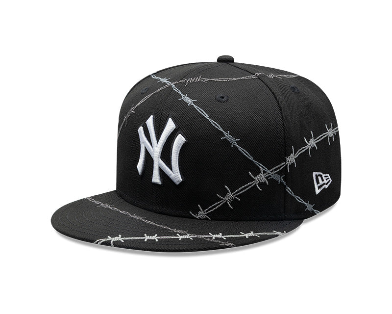 Inspirada en la estética urbana y moderna, esta edición especial presenta bordados en forma de alambres metálicos que cruzan la corona y la visera, generando un contraste visual impactante sobre el fondo negro.