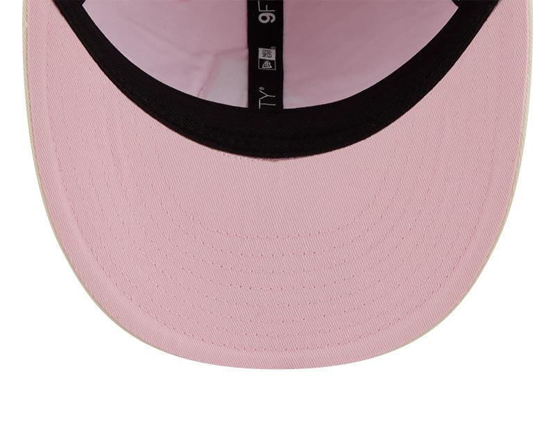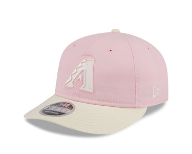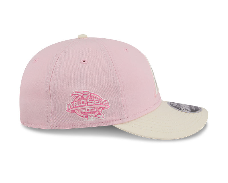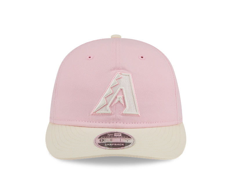 La silueta 9FIFTY Retro Crown (RC) se distingue por tener una estructura menos rígida y una corona más baja y redondeada que la 9FIFTY tradicional, ofreciendo un look retro y un calce más natural. El frente exhibe el logotipo "A" de los Diamondbacks bordado en relieve en color blanco crema. Como detalle exclusivo, el lateral derecho cuenta con un parche conmemorativo bordado en tonos rosas, mientras que la parte posterior incluye un cierre de tela ajustable para un confort personalizado. El diseño se completa con una visera curva y un undervisor rosa a tono con la corona.