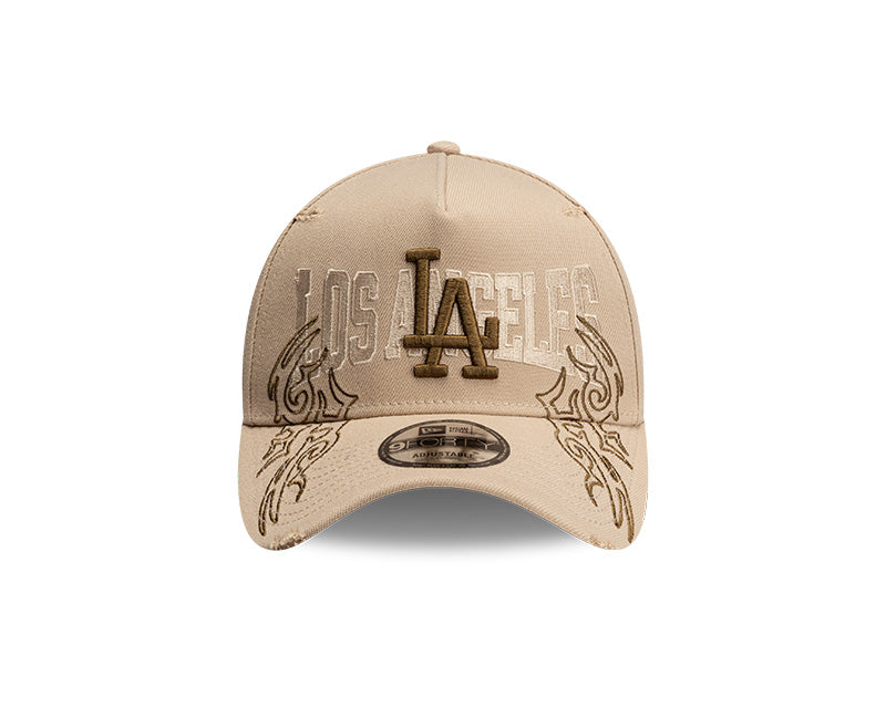 Su diseño incorpora el emblemático logo LA en bordado 3D, acompañado por gráficos tribales en los paneles frontales y visera, más detalles desgastados que le dan un look auténtico y de tendencia.