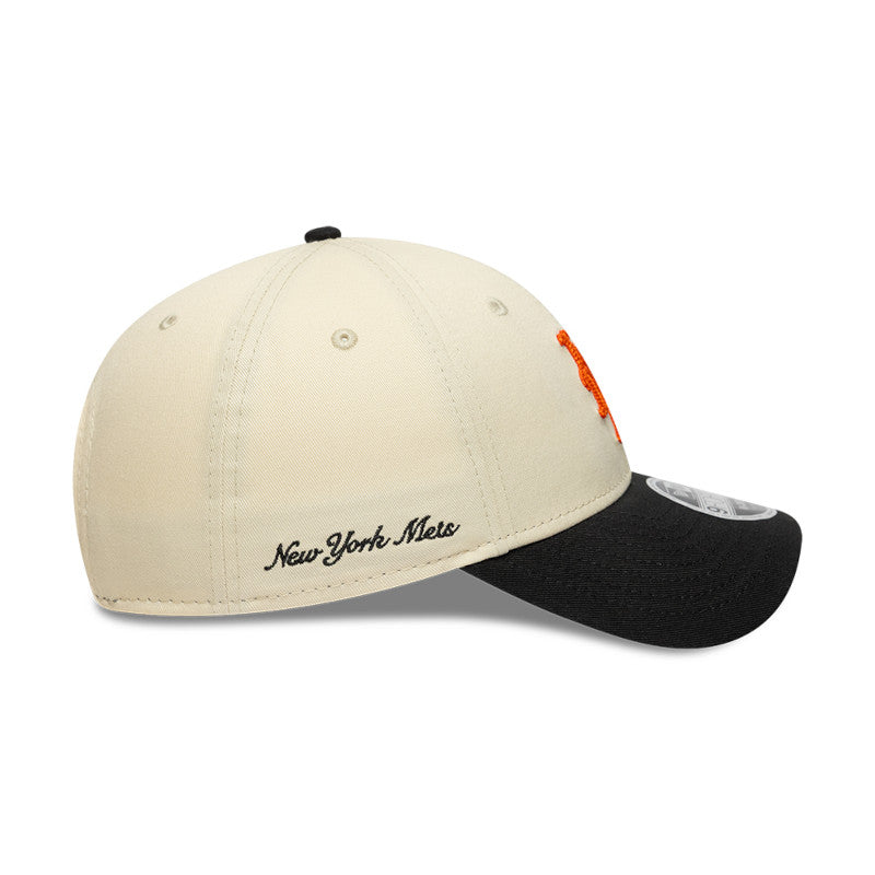 Presenta diseño bicolor en beige crema con visera negra y el logo NY bordado en naranja sobre los paneles frontales. El detalle distintivo es el texto "Mets" bordado en el lateral derecho, añadiendo un elemento gráfico adicional que diferencia esta gorra de los modelos estándar.