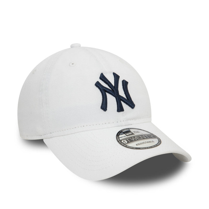La silueta 9TWENTY se caracteriza por su corona desestructurada y de perfil bajo, brindando ese ajuste relajado estilo "Dad Hat" que es sinónimo de comodidad y tendencia. El legendario logotipo "NY" está bordado en relieve en la parte frontal en un profundo color azul marino, creando el contraste perfecto sobre el fondo blanco. El diseño cuenta con una visera curvada y un cierre de tela ajustable con hebilla metálica en la parte posterior, lo que asegura un calce a medida y una durabilidad excepcional para el uso diario.