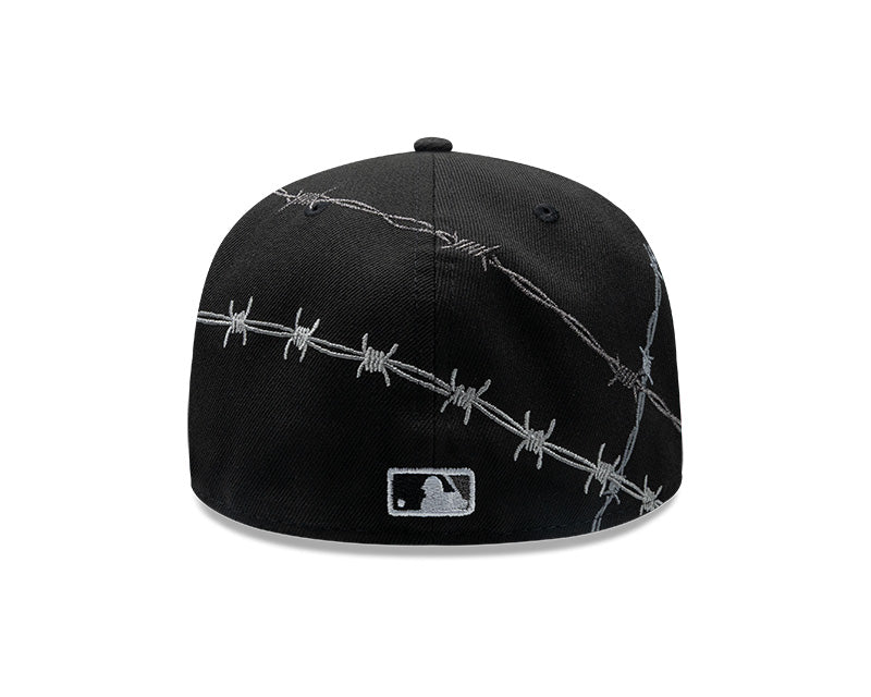Presenta un bordado de alambres en tonos plateados que cruzan la corona y la visera, creando un efecto visual moderno que destaca sobre la base negra.